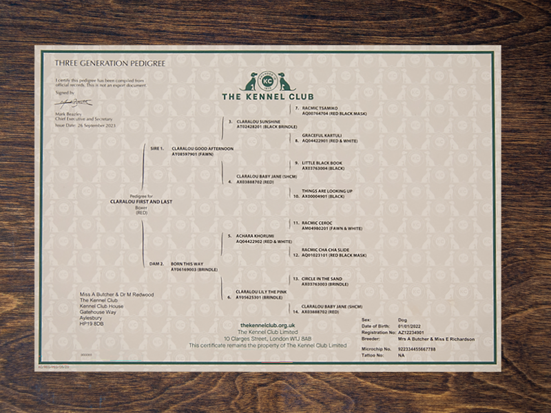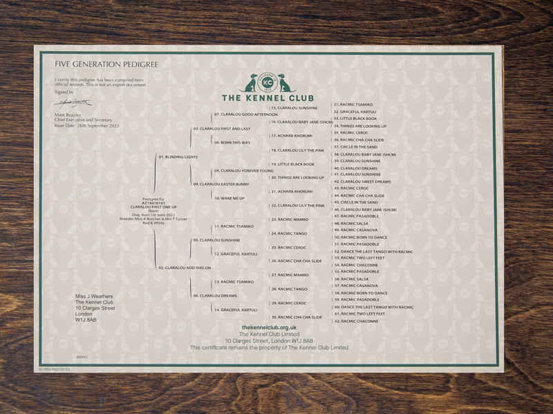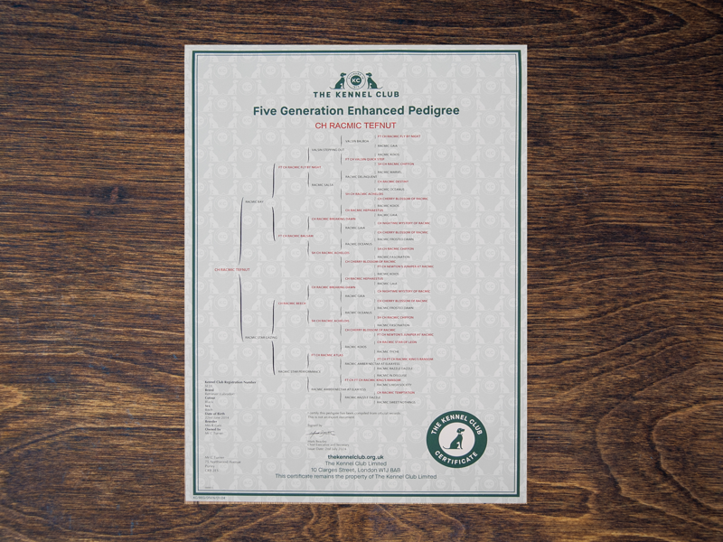 ALL certificates include information of your pedigree dog's ancestry, including breed, colour, sex, date of birth, microchip number, tattoo number, breeder name, and Kennel Club registration numbers.
