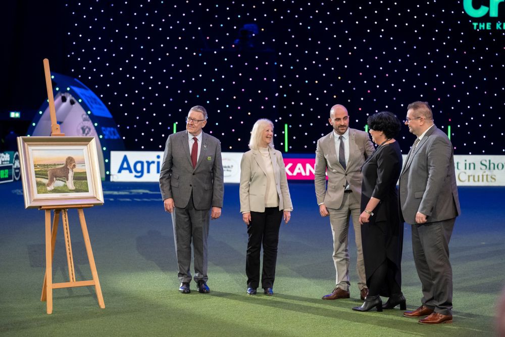 A portrait of last year’s Crufts Best in Show winner, Am GCh Kan Trace Very Cheeky Chic, a Lagotto Romagnolo, known at home as Orca, was unveiled at Crufts 2024 on Friday 8 March in the Resorts World Arena at the NEC, Birmingham.