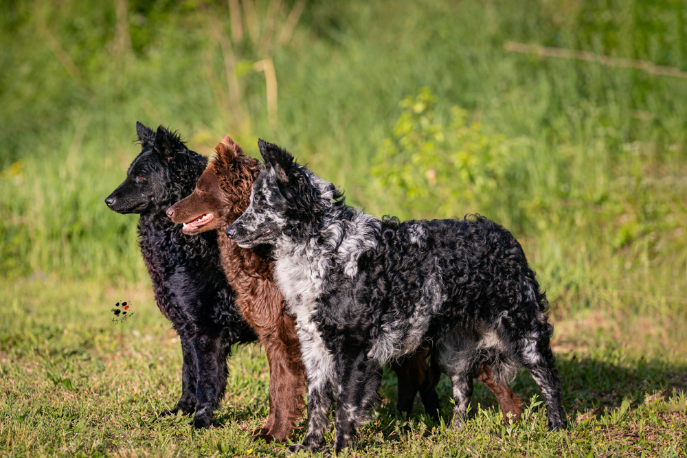 “Mudis need little grooming. Their fur sheds naturally and only needs to be brushed to assist shedding or remove foreign objects or the occasional knot as the action also flattens the coat. Most Mudis love water and will happily splash and swim, which not only cleans the coat but also restores its characteristically lush curls and waves.