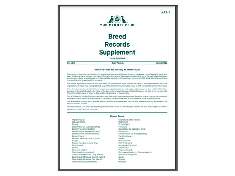 A quarterly publication, in which all litter registrations, changes of ownership, imports, exports, awards, health tests and registration statistics are listed by breed and sold by group.