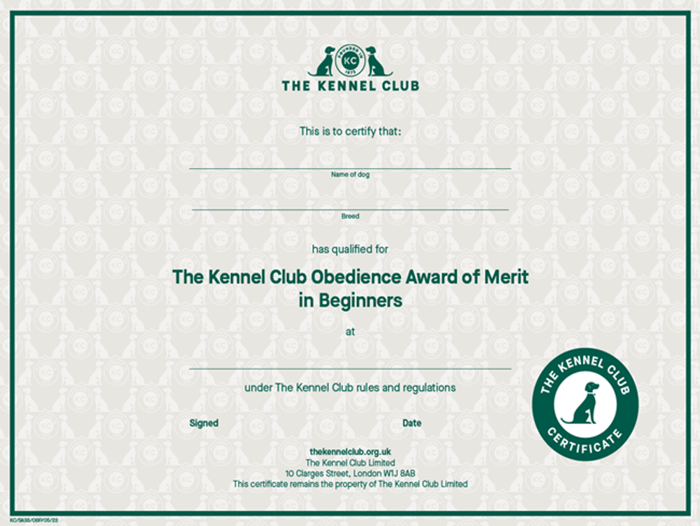 Obedience Societies may offer Award of Merit certificates at their shows for competitors in introductory, pre-beginners and beginners classes.